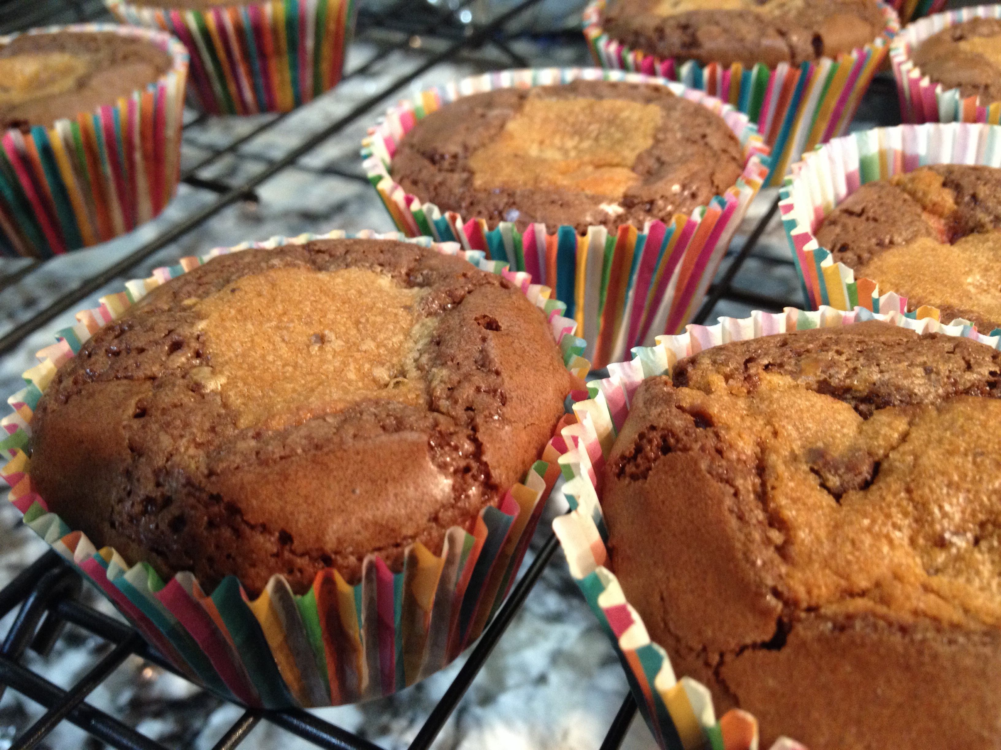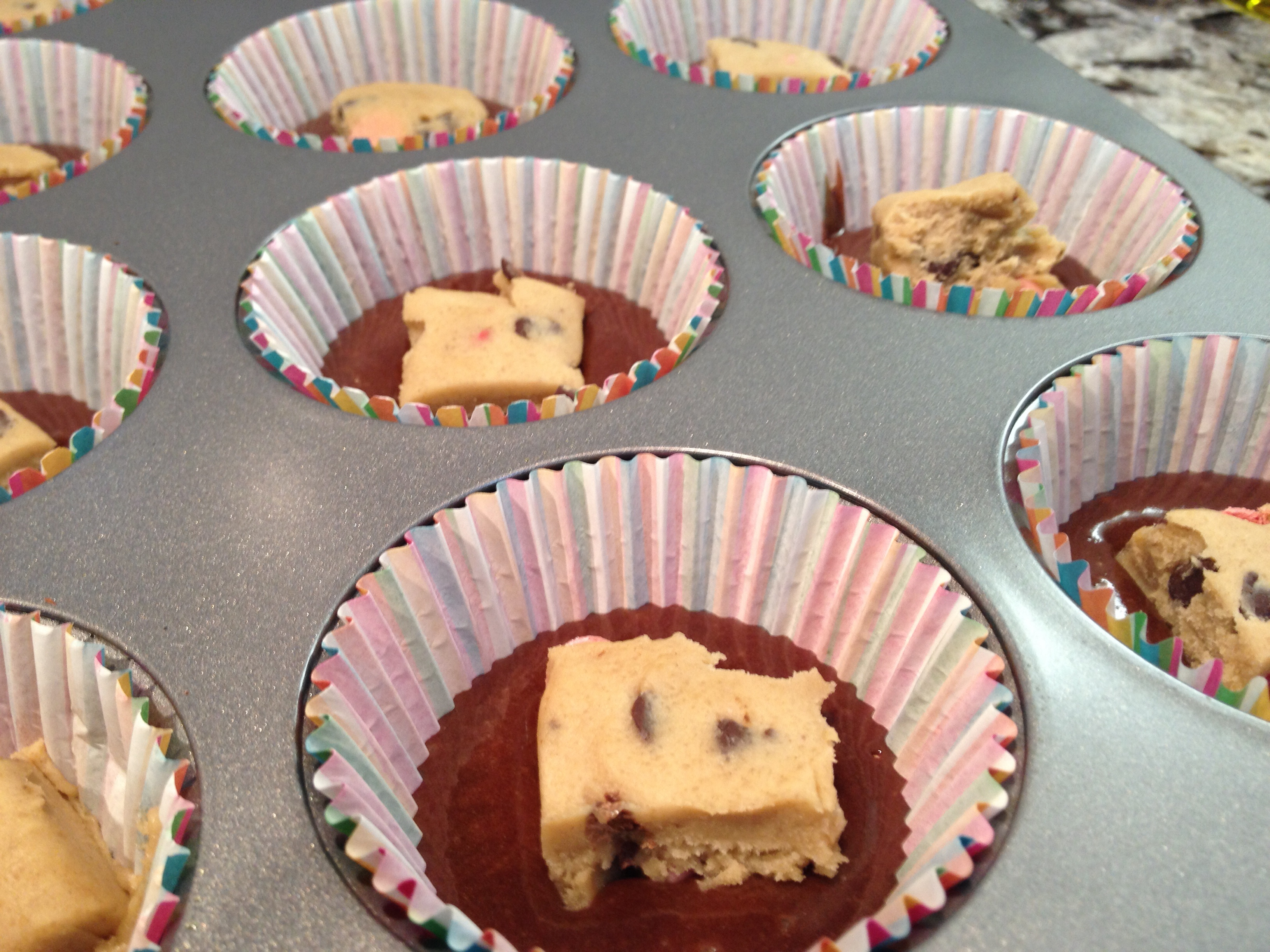Simply grease a muffin tin or use foil liners, fill them 1/4 of the way with brownie mix(OK- you do need to mix 4 ingredients for this part) and drop a piece of the cookie dough on top. Bake in the oven at 350 for about 20-25 minutes, use a toothpick to see if anything sticks and you are done.