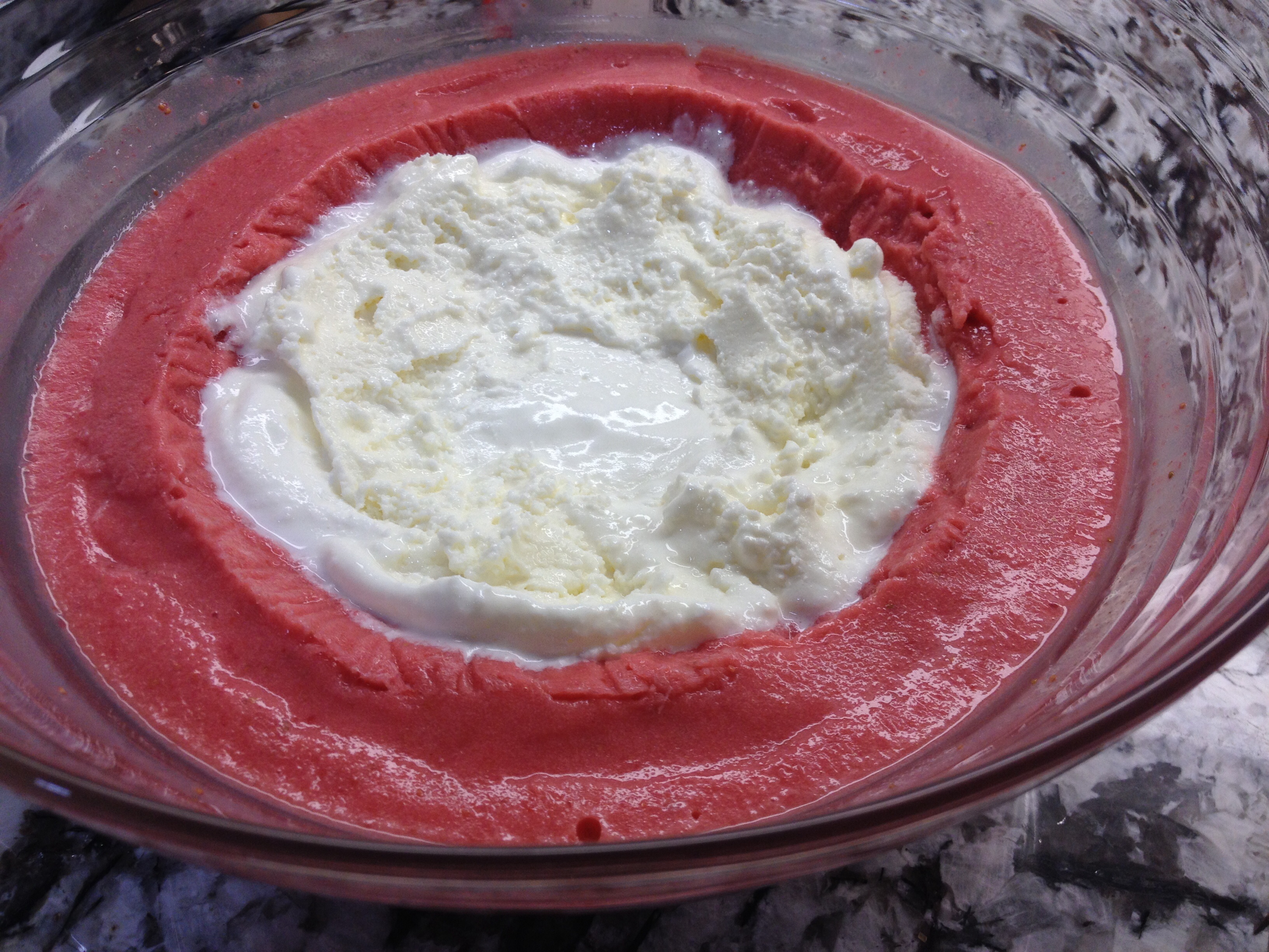 Step 1: Freeze your large bowl, get all of your ingredients and let the ice creams soften before using.(We made our strawberry frozen yogurt so this was step 1 for us.)