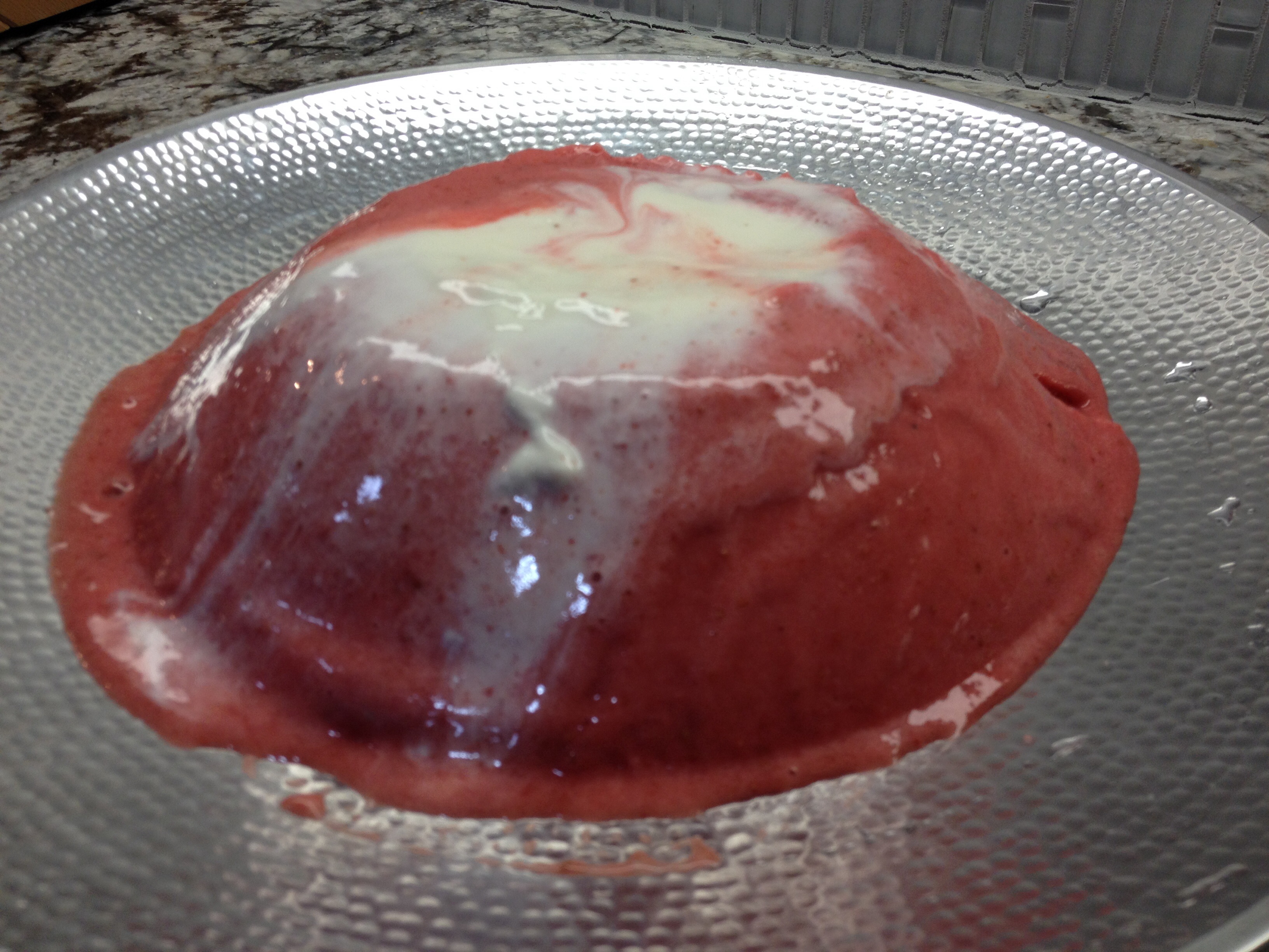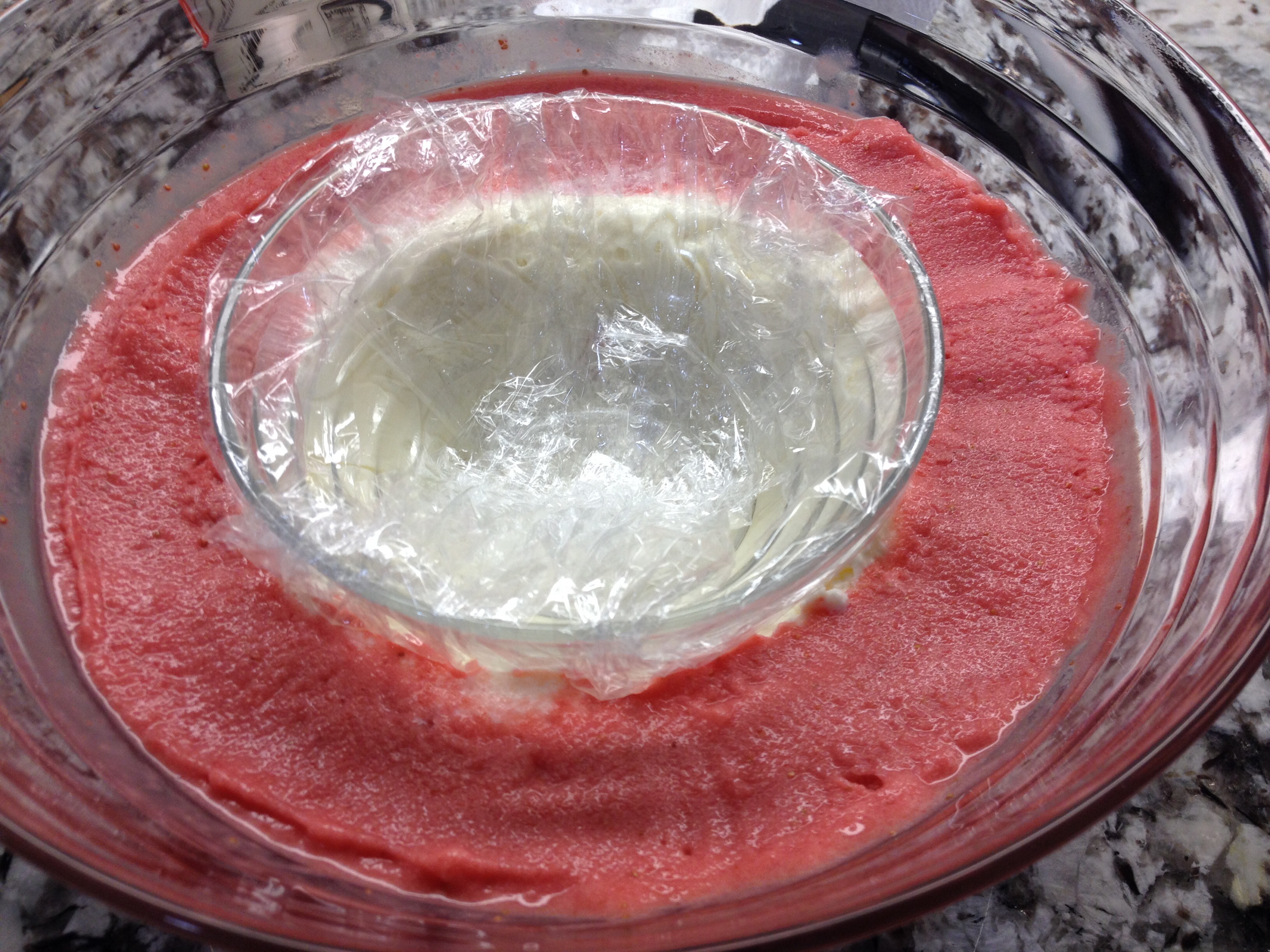 Step 2: Fill the large bowl with your first flavor and insert the medium bowl to shape the dome(be careful to leave ice cream/yogurt at the bottom-see pic below since I messed up!) Freeze.