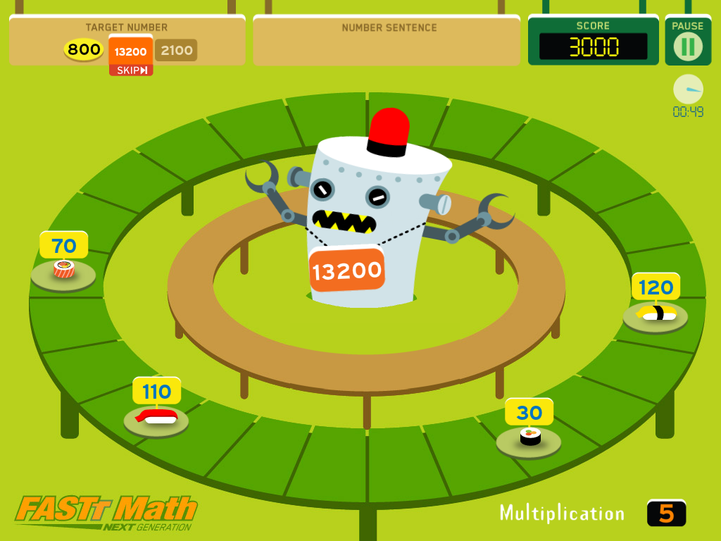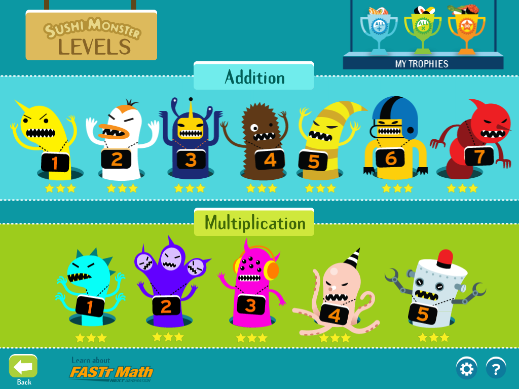 Let’s start with Sushi Monster. It’s a math game by Scholastic with a monster in the middle of the “sushi bar” holding up a number. Depending on what game you choose, addition or multiplication, you choose two numbered pieces of sushi that equal that number when added or multiplied together. There are 7 levels of addition and 5 levels of multiplication and your child can earn trophies for their success! I would recommend this for multiplication once you know the basic multiplication tables for great practice but for those who already have the basics for addition, go for it!