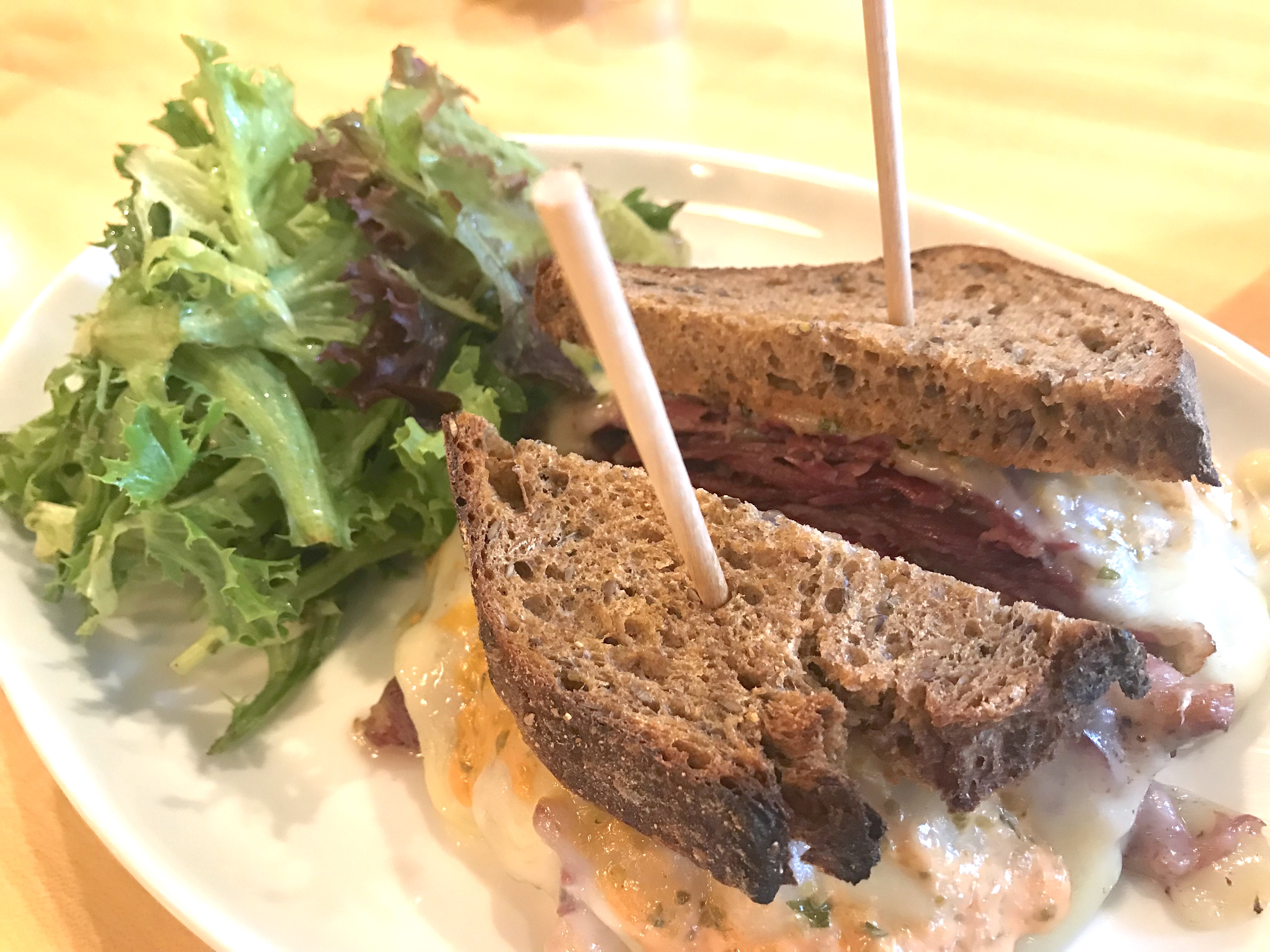 Homemade Pastrami Sandwich with gruyére, red cabbage slaw, thousand island dressing, rye