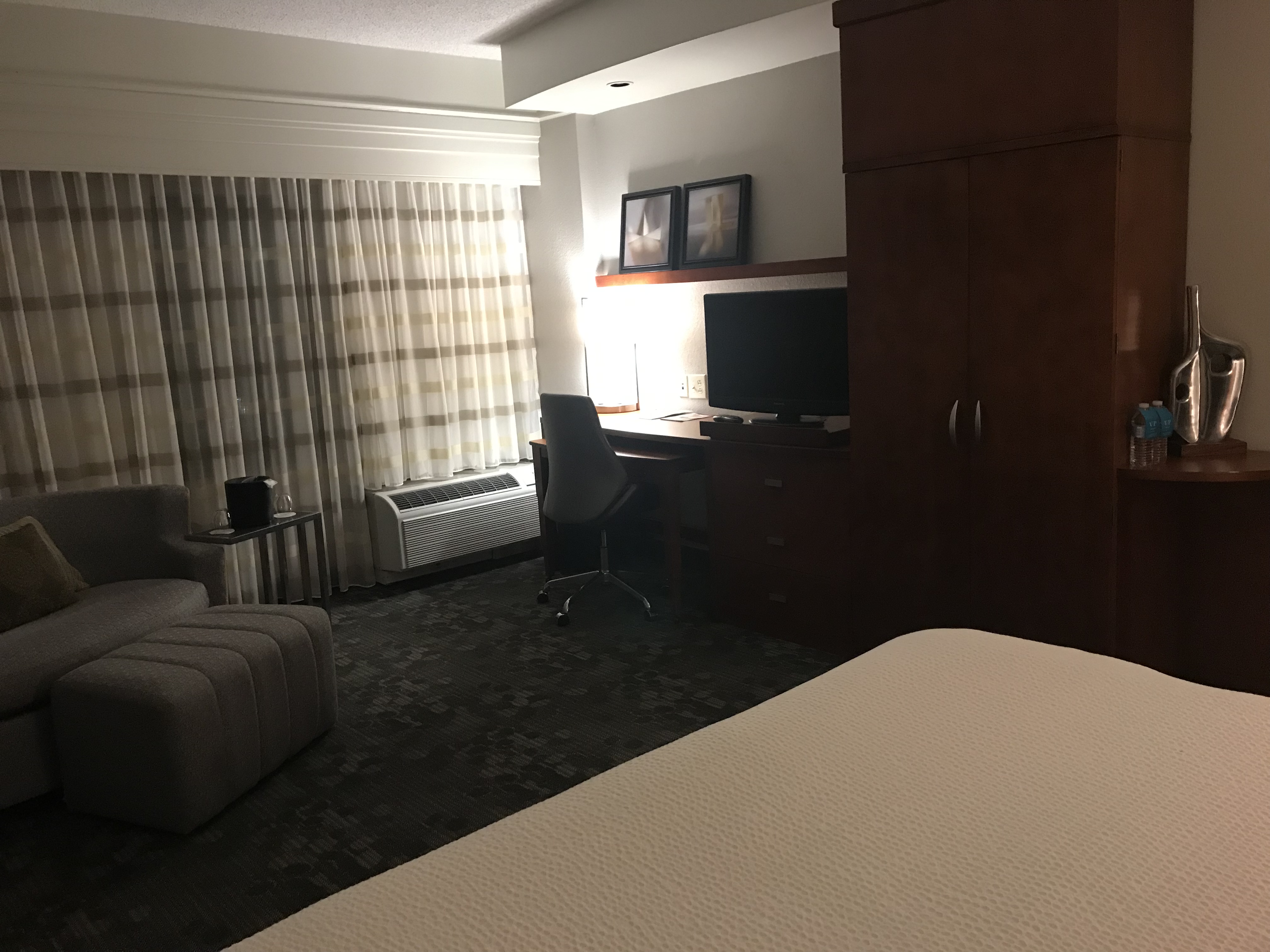 Hotel: Courtyard Houston by the Galleria Would I stay again? Yes. The hotel staff was great, the rooms are updated, the lobby has the standard courtyard bistro plus it is in the galleria so you can walk to numerous restaurants and the Galleria Mall. It is off the main corridor and has a parking garage.